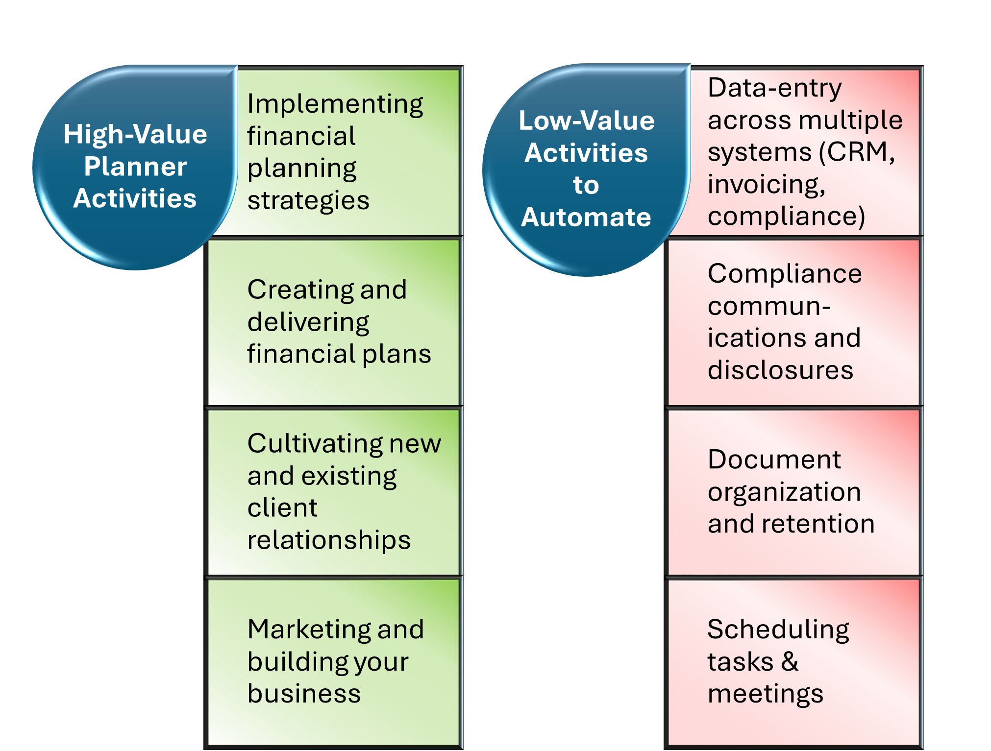 Automation platforms, such as Zapier, are most powerful when combined with a data intake platform such as JotForm (freeware) or PreciseFP (much better). These programs shift the task of data entry onto the prospect/client in the form of personalized and branded online templates. Zapier can then extract form data and send it to different programs for various purposes. Data intake programs may also have their own useful integrations as well. For instance, one can make a custom fact finder in PreciseFP which directly communicates and sets up assets, liabilities, and income data in several financial planning programs (e.g. RightCapital, Moneyguide, eMoney).