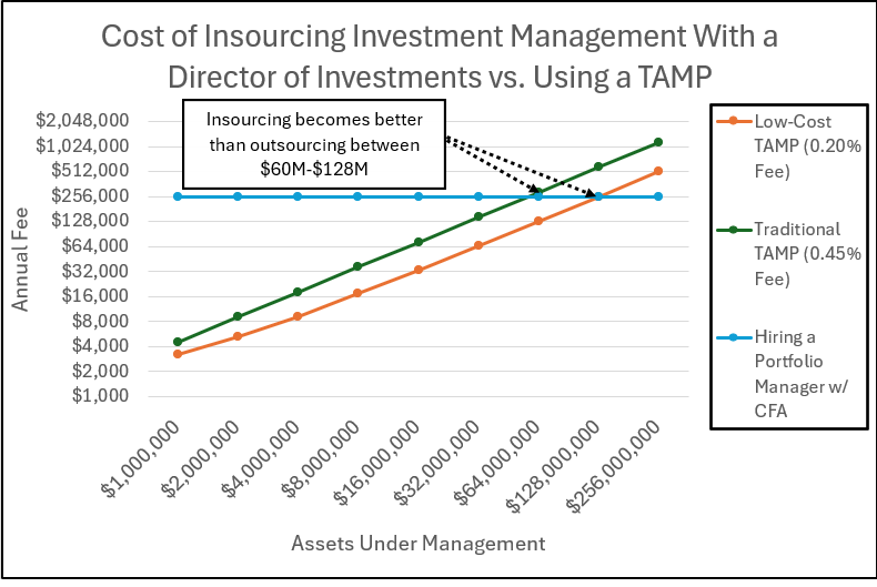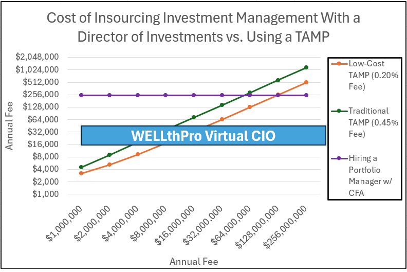 What we find is that TAMPs are likely better versus hiring a CIO for advisors with under $60M (traditional TAMP) to $128M (low-cost TAMP) in assets. At this level of assets, advisors incur between $250,000 to $576,000 in costs per year.
